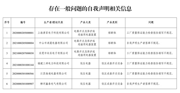 本次核查工作覆蓋實施CCC認證自我聲明評價方式的電路開關及保護或連接用電器裝置、低壓電器、小功率電動機、電動工具、電焊機、家用和類似用途設備、電子產品及安全附件、車輛及安全附件等全部8類產品。核查發現14份自我聲明存在報送空白符合性信息等嚴重問題,441份自我聲明存在報送信息不規范等一般問題。